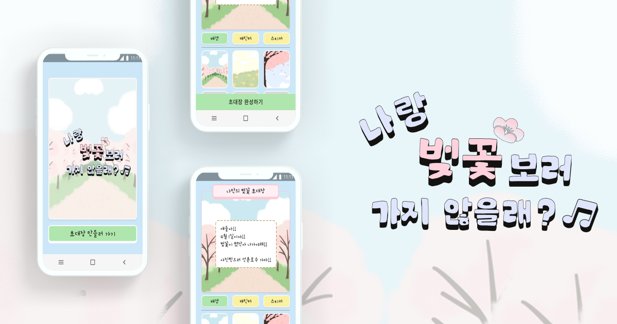 우리의 아이디어는 벚꽃 시즌에 맞게 초대장을 만들고 장식하고 공유할 수 있는 웹 서비스입니다. 최근에는 단순히 CRUD가 아닌 새로운 기능을 개발하고 싶어서 Interactive Developer의 코드를 따라가 보았습니다. 같은 이유로 캐릭터/스티커를 끌어다 놓아 초대장을 꾸미는 기능을 만들고 싶다고 항의하여 채택하게 되었습니다. 데모 버전에는 MVP만 포함하기로 하고 드래그 앤 드롭 기능 대신 클릭한 좌표를 계산하고 거기에 캐릭터/스티커를 렌더링하는 기능을 개발했습니다.